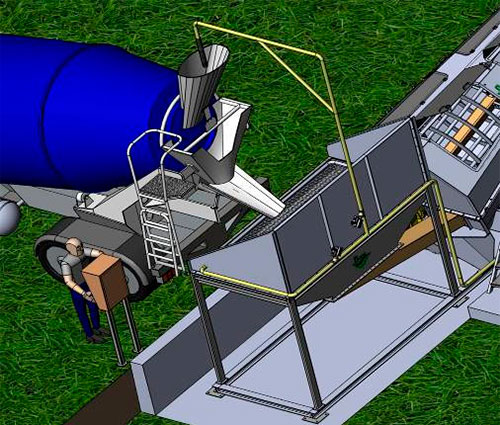 Выгрузка остаточной бетонной смеси осуществляется в приемный бункер Установки. Далее, шнековой подачей смесь продвигается по моечной системе, очищаясь при этом встречным потоком чистой воды. Лёгкие составляющие бетонной смеси вымываются водой, а более тяжёлые частицы (щебёночно-песчаная смесь) оседают на дне бункера и при помощи шнека выгружаются в специально подготовленный отсек. Вода с лёгкими частицами (цемента), перекачивается из верхней части бункера по отводной трубе в бассейн рециркулированной воды. В бассейне установлен агитатор, который поддерживает смесь в постоянной консистенции, не позволяя оседать ее частицам. Щебёночно-песчаная смесь, из специально подготовленного отсека, подаётся погрузчиком в один из расходных бункеров бетонного завода, а цементная взвесь закачивается, по мере необходимости, в смеситель. В итоге мы получаем замкнутый цикл производства бетонных смесей.